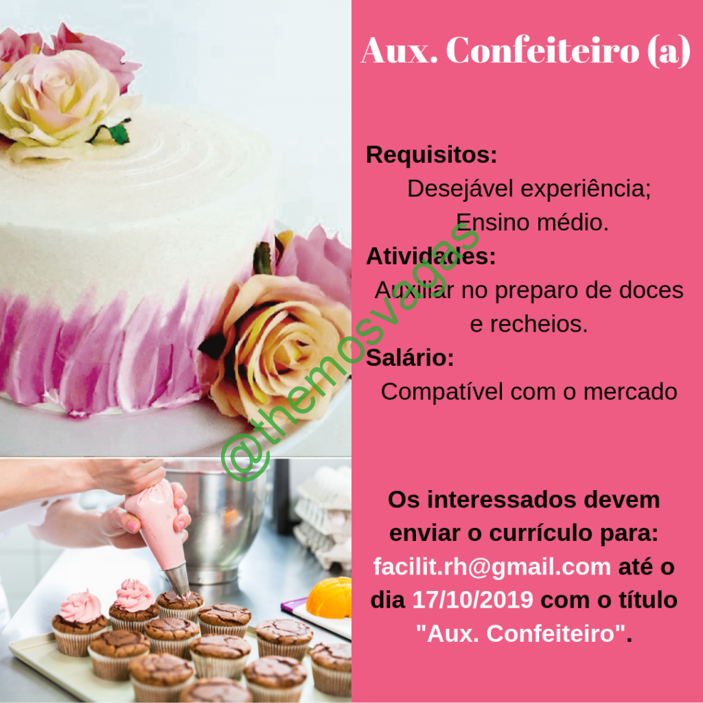– Interessados(as) e que atendam ao perfil solicitado acima, devem enviar o currículo até 17/10/2019 para o e-mail facilit.rh@gmail.com contendo no título/assunto “Aux. Confeiteiro THE“.
