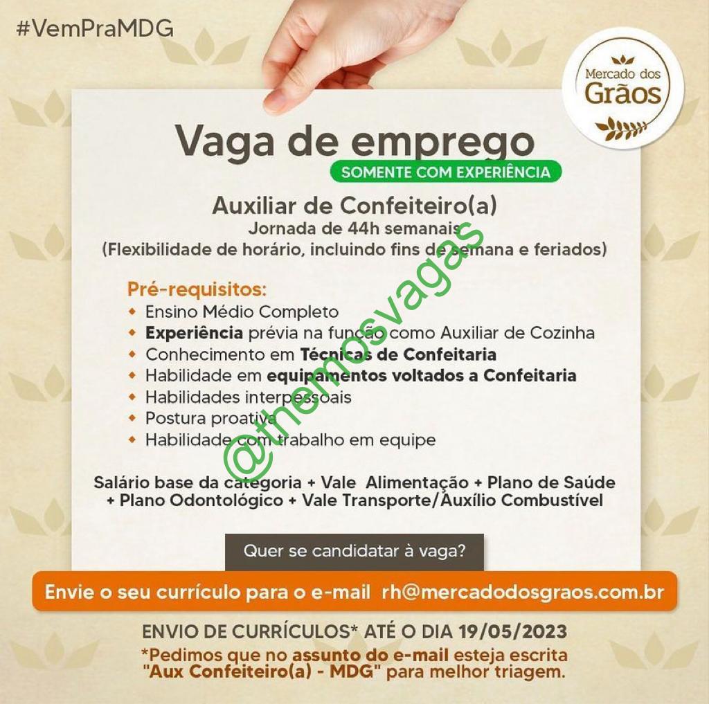 – Interessados(as) e que atendam ao perfil solicitado acima, devem enviar o currículo até 19/05/2023 para o e-mail rh@mercadodosgraos.com.br contendo no título/assunto “Aux Confeiteiro(a) – MDG“.