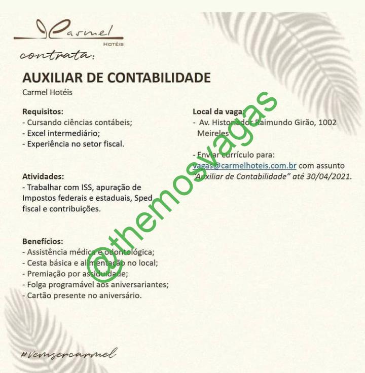 – Interessados(as) e que atendam ao perfil solicitado acima, devem enviar até o dia 30|04|2021 o currículo para o e-mail vagas@carmelhoteis.com.br, contendo no título/assunto “Auxiliar de Contabilidade – FOR”.