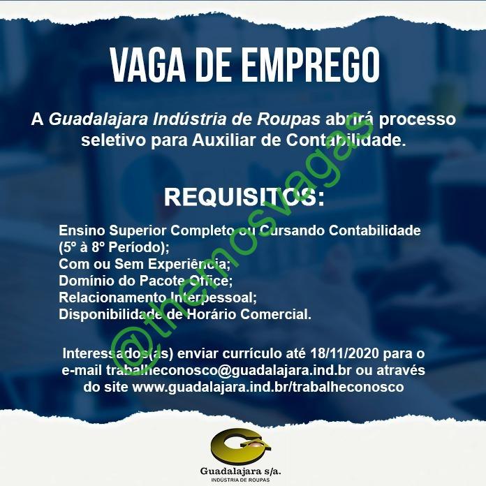 – Interessados(as) e que atendam ao perfil solicitado acima, devem enviar o currículo até 18/11/2020 para o e-mail trabalheconosco@uadalajara.ind.br contendo no título/assunto “Auxiliar de Contabilidade THE
