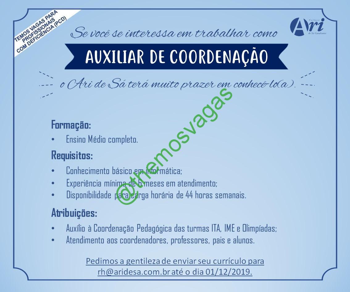 – Interessados(as) e que atendam ao perfil solicitado acima, devem enviar até o dia 01/12/2019 o currículo para o e-mail rh@aridesa.com.br , colocando no título “Auxiliar de Coordenação”.