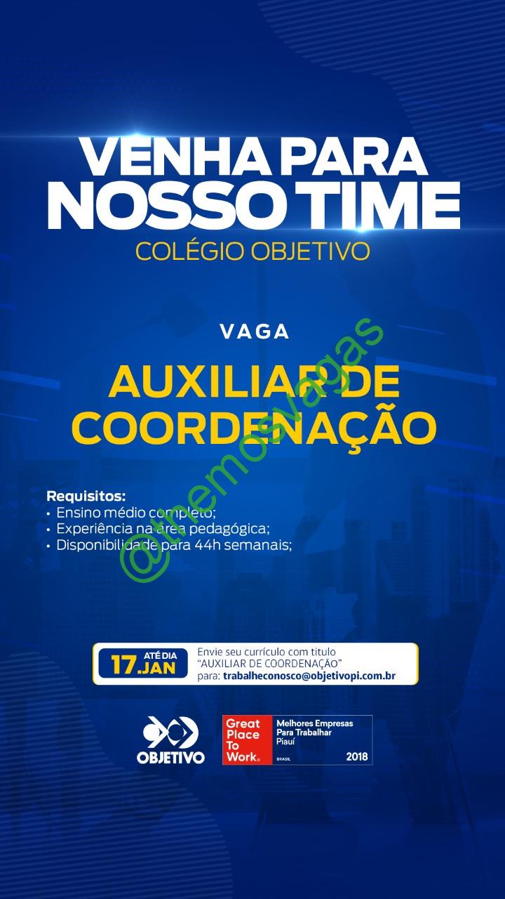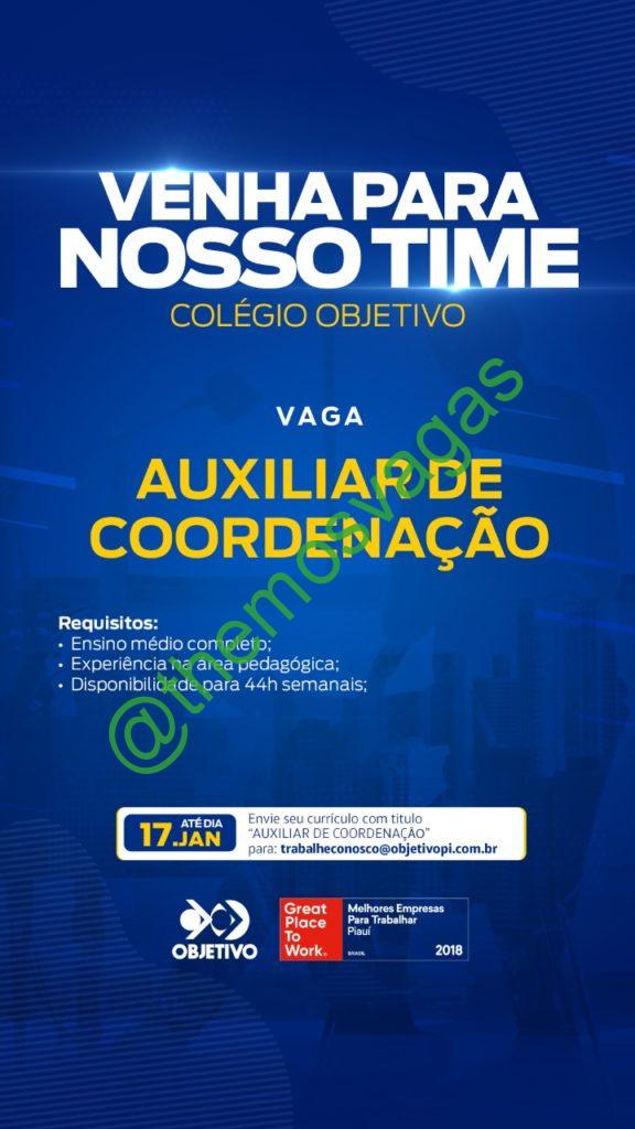 – Interessados(as) e que atendam ao perfil solicitado acima, devem enviar o currículo até 17/01/2021 para o e-mail trabalheconosco@objetivopi.com.br contendo no título/assunto “Auxiliar de Coordenação THE