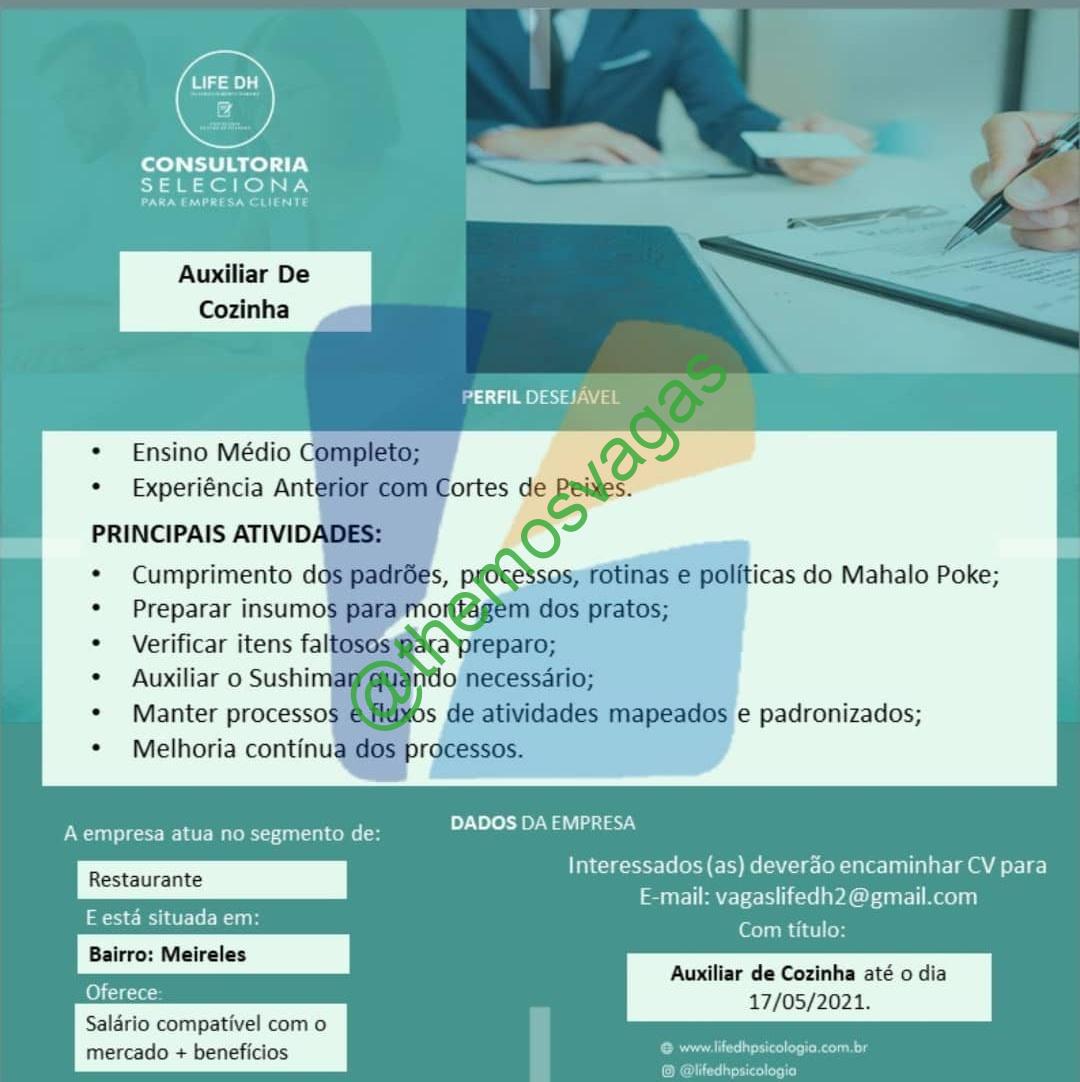 – Interessados(as) e que atendam ao perfil solicitado acima, devem enviar o currículo até 17/05/2021 para o e-mail vagaslifedh2@gmail.com, contendo no título/assunto “Auxiliar de Cozinha – FOR“.