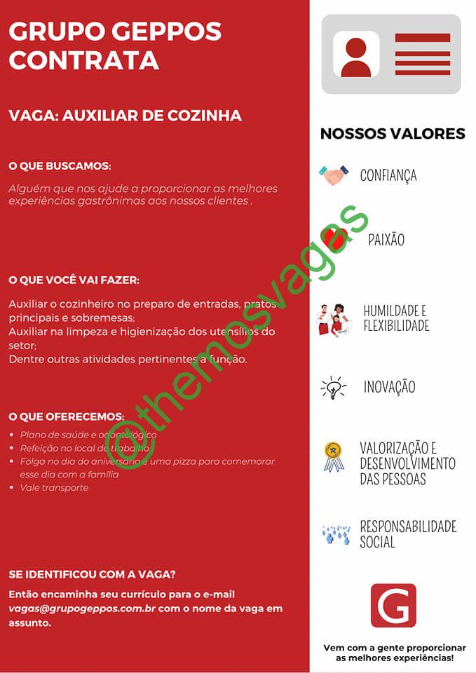 – Interessados(as) e que atendam ao perfil solicitado acima, devem enviar o currículo para o e-mail vagas@grupogeppos.com.br, contendo no titulo/assunto “Auxiliar de Cozinha – FOR”.