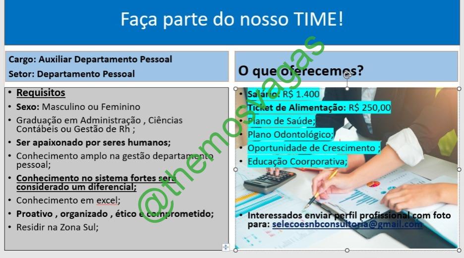 – Interessados(as) e que atendam ao perfil solicitado acima, devem enviar o currículo para o e-mail selecoesnbconsultoria@gmail.com contendo no título/assunto “Auxiliar de Departamento Pessoal – THE