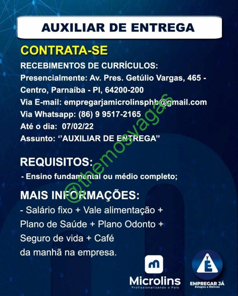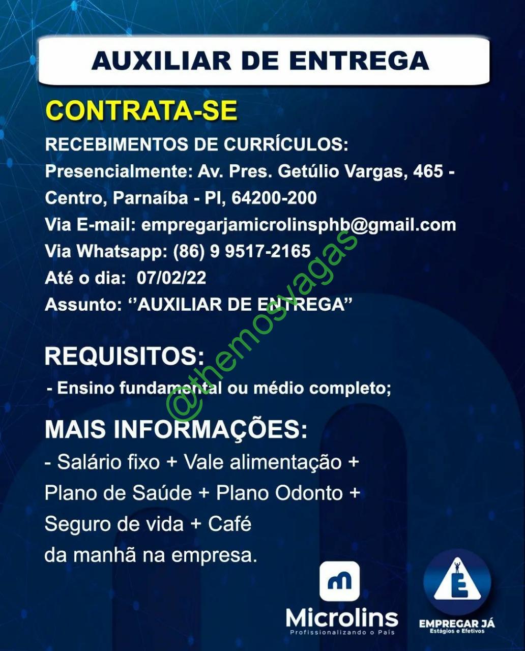 – Interessados(as) e que atendam ao perfil solicitado acima, devem enviar o currículo até 07/02/2022  para o e-mail empregarjamicrolinsphb@gmail.com contendo no título/assunto “Auxiliar de Entrega” ou através do whatsapp  86 9517-2165