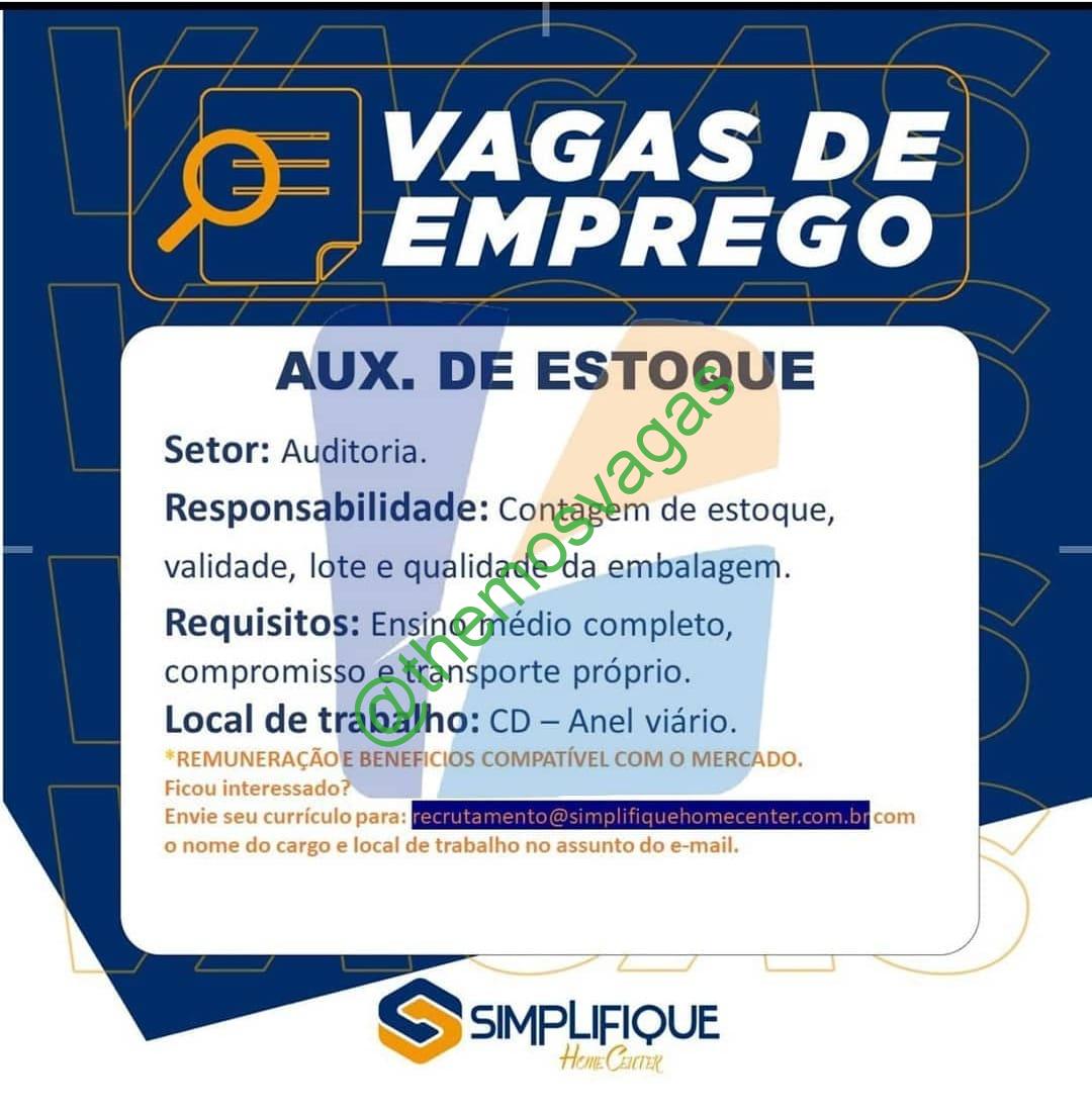 – Interessados(as) e que atendam ao perfil solicitado acima, devem enviar o currículo para o e-mail recrutamento@simplifiquehomecenter.com.br, contendo no titulo/assunto “Auxiliar de Estoque FOR”.