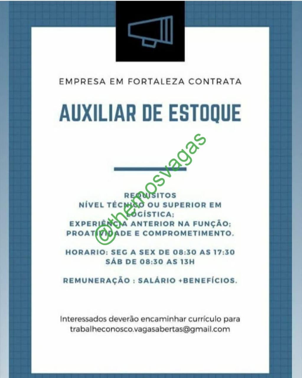 – Interessados(as) e que atendam ao perfil solicitado acima, devem enviar o currículo para o e-mail trabalheconosco.vagasabertas@gmail.com, contendo no titulo/assunto “Auxiliar de Estoque – FOR”
