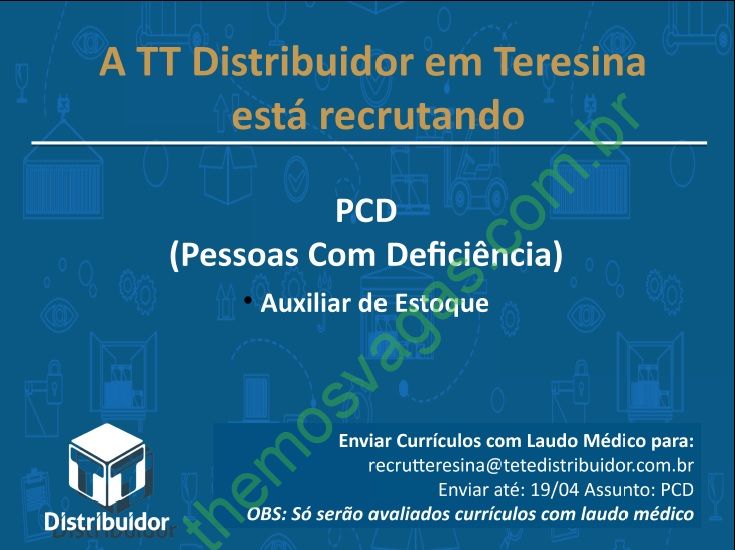 – Interessados(as) e que atendam ao perfil solicitado acima devem enviar o currículo até 19/04/2019 para o e-mail recrutteresina@tetedistribuidor.com.br contendo no título “PCD”.