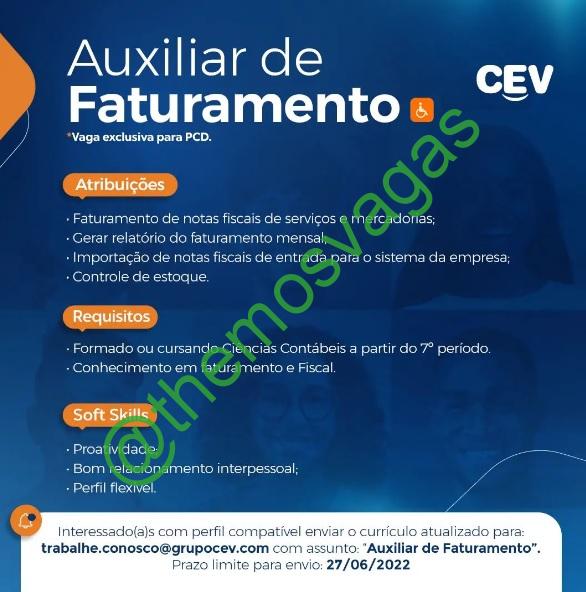 – Interessados(as) e que atendam ao perfil solicitado acima, devem enviar o currículo até 27/06/2022  para o e-mail trabalhe.conosco@grupocev.com contendo no título/assunto “Auxiliair de Faturamento