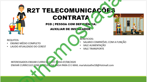 – Interessados(as) e que atendam ao perfil solicitado acima, devem enviar o currículo  até 07/08/2020  para o e-mail marialuizathe18@hotmail.com contendo no título/assunto “Auxiliar de Instalação PCD