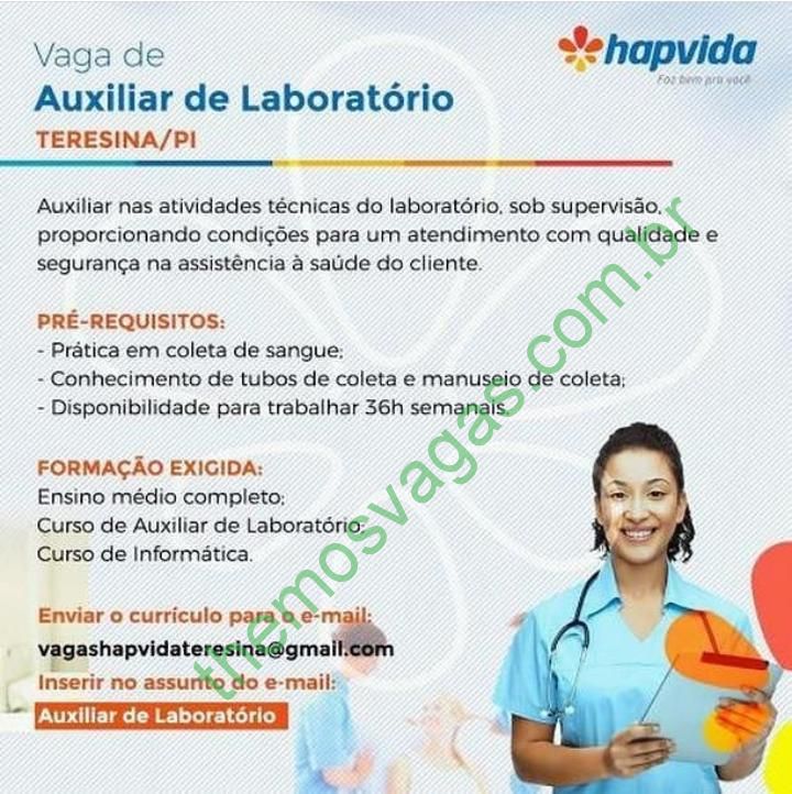 – Interessados(as) e que atendam aos requisitos devem enviar o perfil profissional, colocando no título do e-mail “Auxiliar de Laboratório”, para: vagashapvidateresina@gmail.com