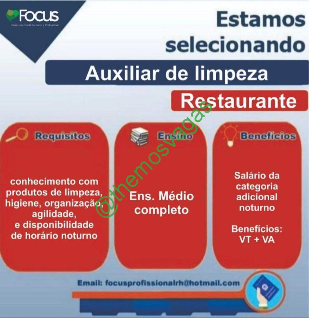 – Interessados(as) e que atendam ao perfil solicitado acima, devem enviar o currículo para o e-mail focusprofissionalrh@hotmail.com contendo no título/assunto “Auxiliar de Limpeza  – THE