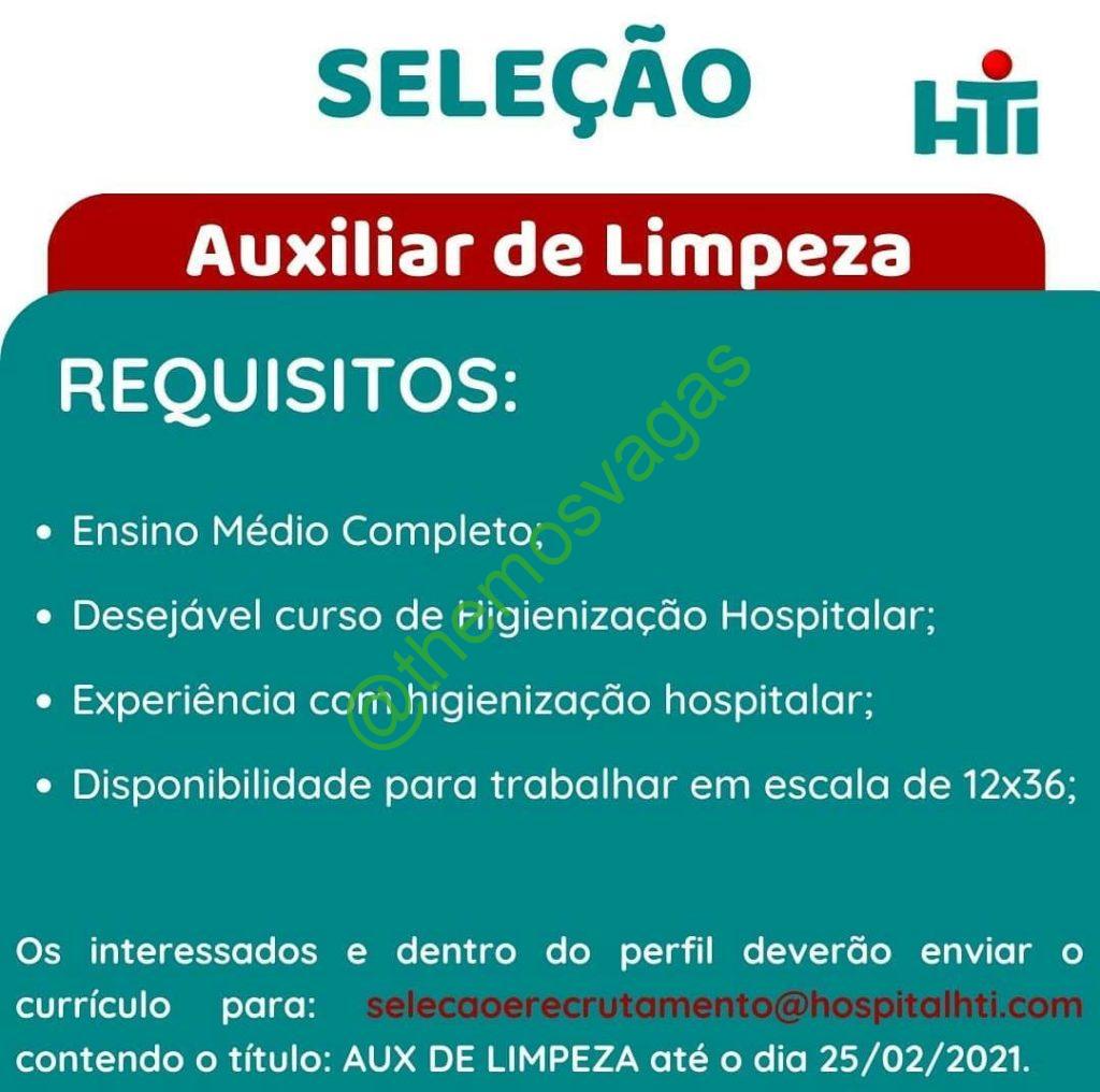 – Interessados(as) e que atendam ao perfil solicitado acima, devem enviar o currículo até 25/02/2021 para o e-mail selecaoerecrutamento@hospitalhti.com contendo no título/assunto “Aux Limpeza THE