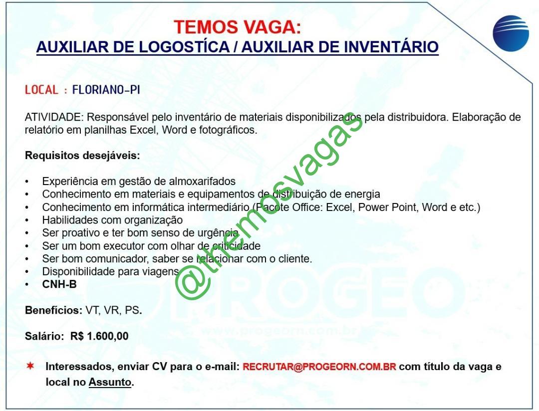 – Interessados(as) e que atendam ao perfil solicitado acima, devem enviar o currículo para o e-mail recrutar@progeorn.com.br , contendo no título/assunto “Aux Logística – Floriano/PI“.