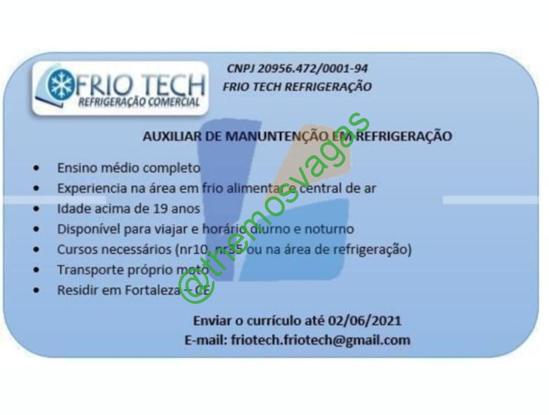 – Interessados(as) e que atendam ao perfil solicitado acima, devem enviar o currículo para o e-mail friotech.friotech@gmail.com, contendo no titulo/assunto “Auxiliar de Manutenção em Refrigeração – FOR