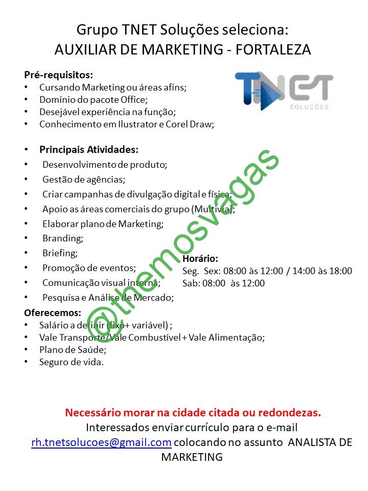 – Interessados(as) e que atendam ao perfil solicitado acima, devem enviar o currículo para o e-mail rh.tnetsolucoes@gmail.com , colocando no título “Auxiliar de Marketing”.