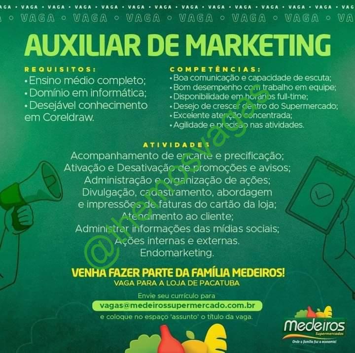 – Interessados(as) e que atendam ao perfil solicitado acima, devem enviar o currículo para o e-mail vagas@medeirossupermercado.com.br, contendo no título/assunto “Auxiliar de Marketing – FOR“.