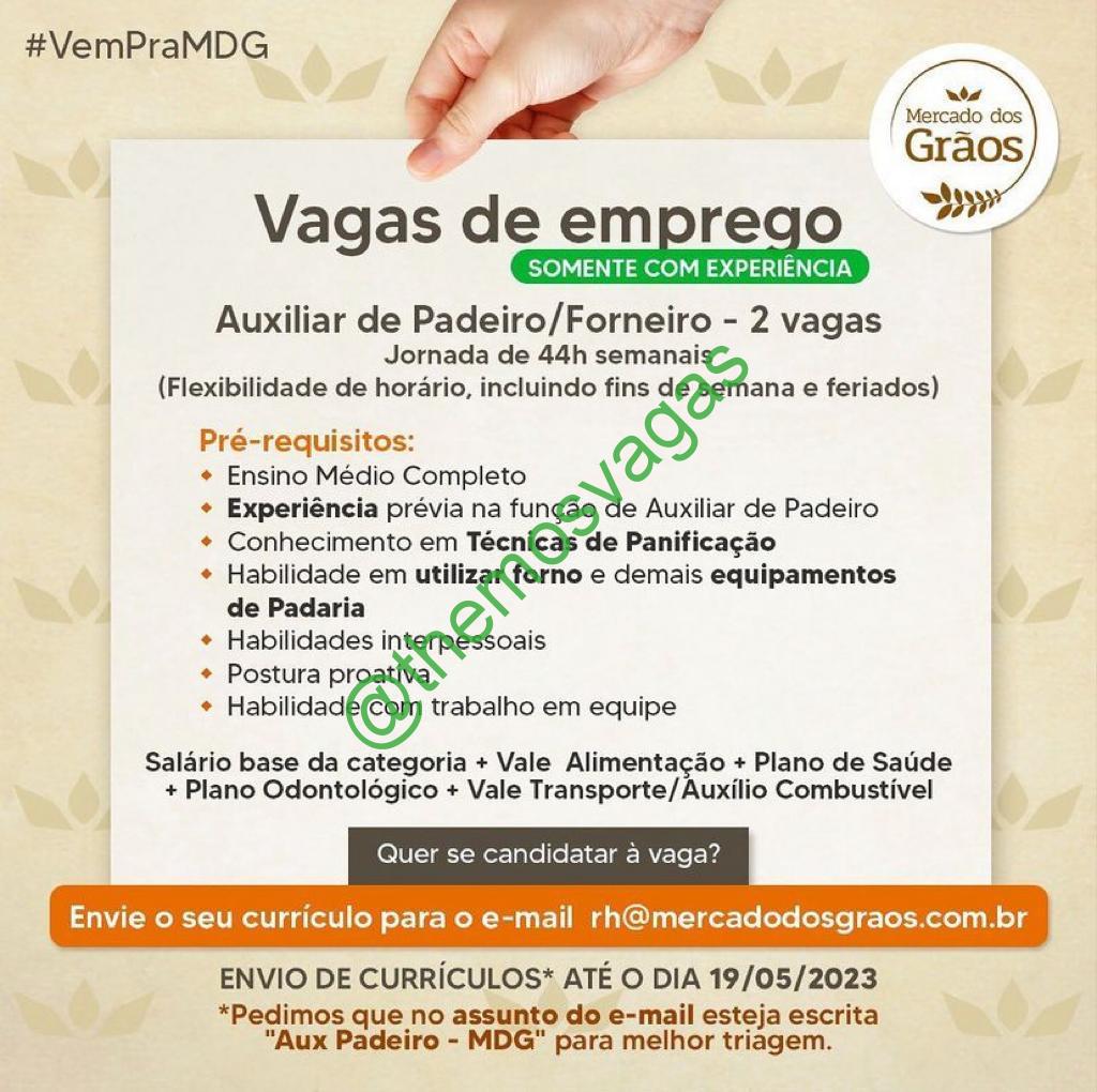 – Interessados(as) e que atendam ao perfil solicitado acima, devem enviar o currículo até 19/05/2023 para o e-mail rh@mercadodosgraos.com.br contendo no título/assunto “Aux Padeiro – MDG“.