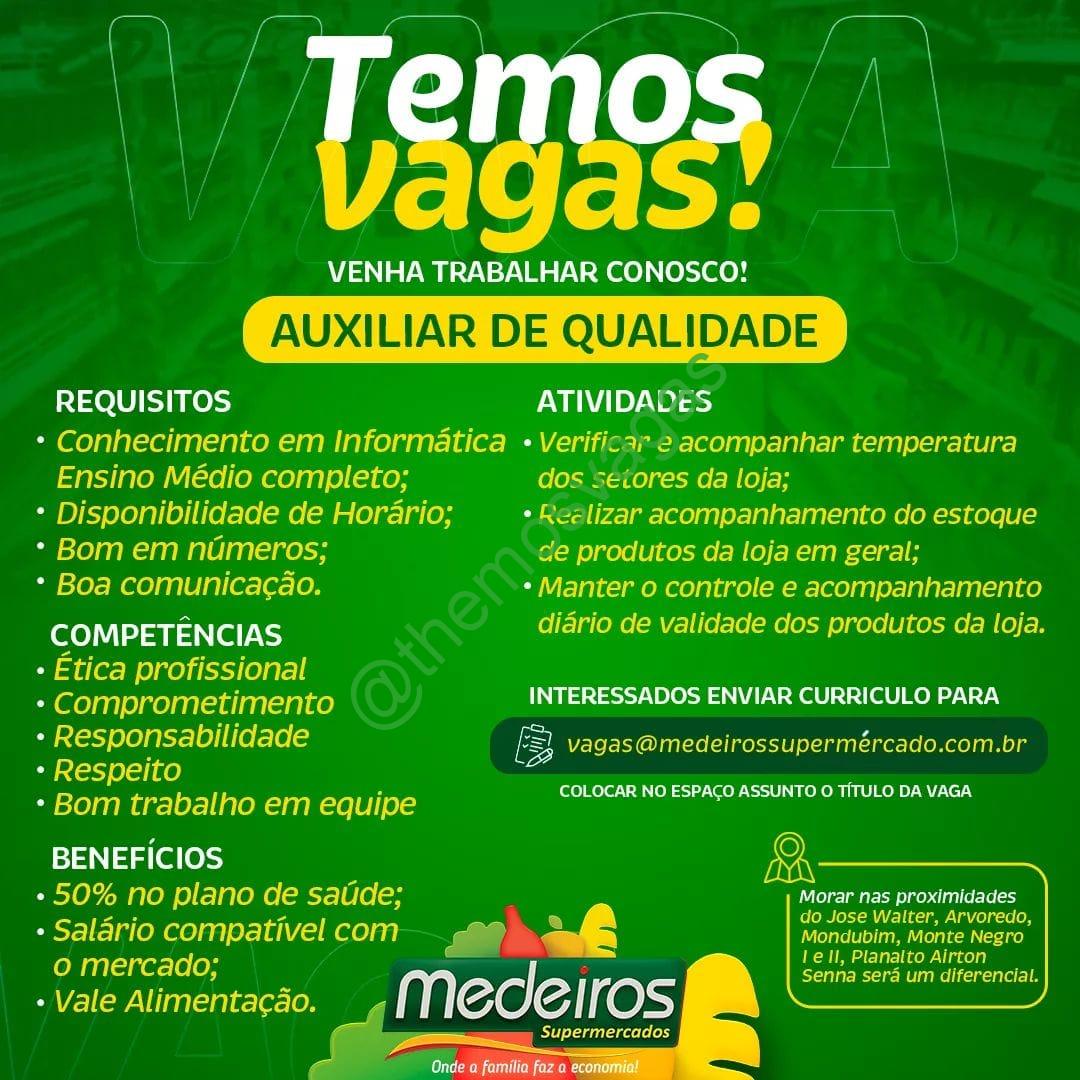 – Interessados(as) e que atendam ao perfil solicitado acima, devem enviar o currículo para o e-mail vagas@medeirossupermercado.com.br, contendo no titulo/assunto “Auxiliar de Qualidade – FOR”.