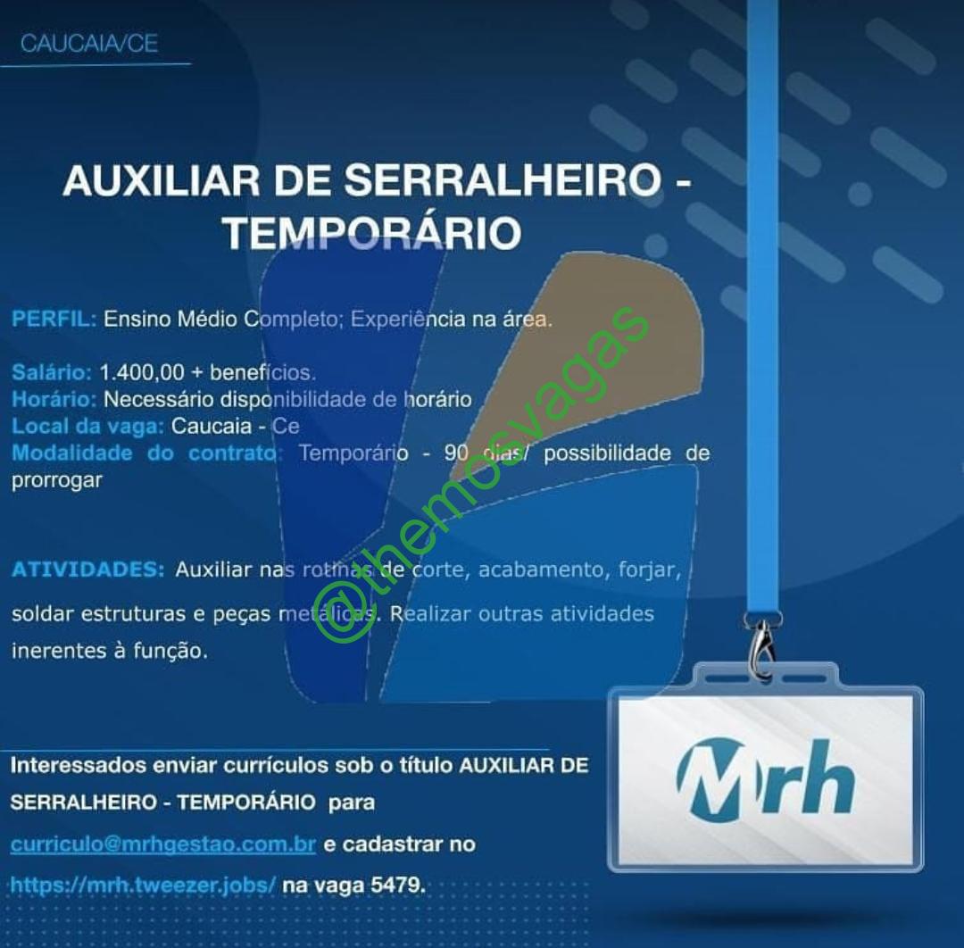 – Interessados(as) e que atendam ao perfil solicitado acima, devem enviar o currículo para o e-mail curriculo@mrhgestao.com.br, contendo no titulo/assunto “Auxiliar de Serralheiro – FOR”