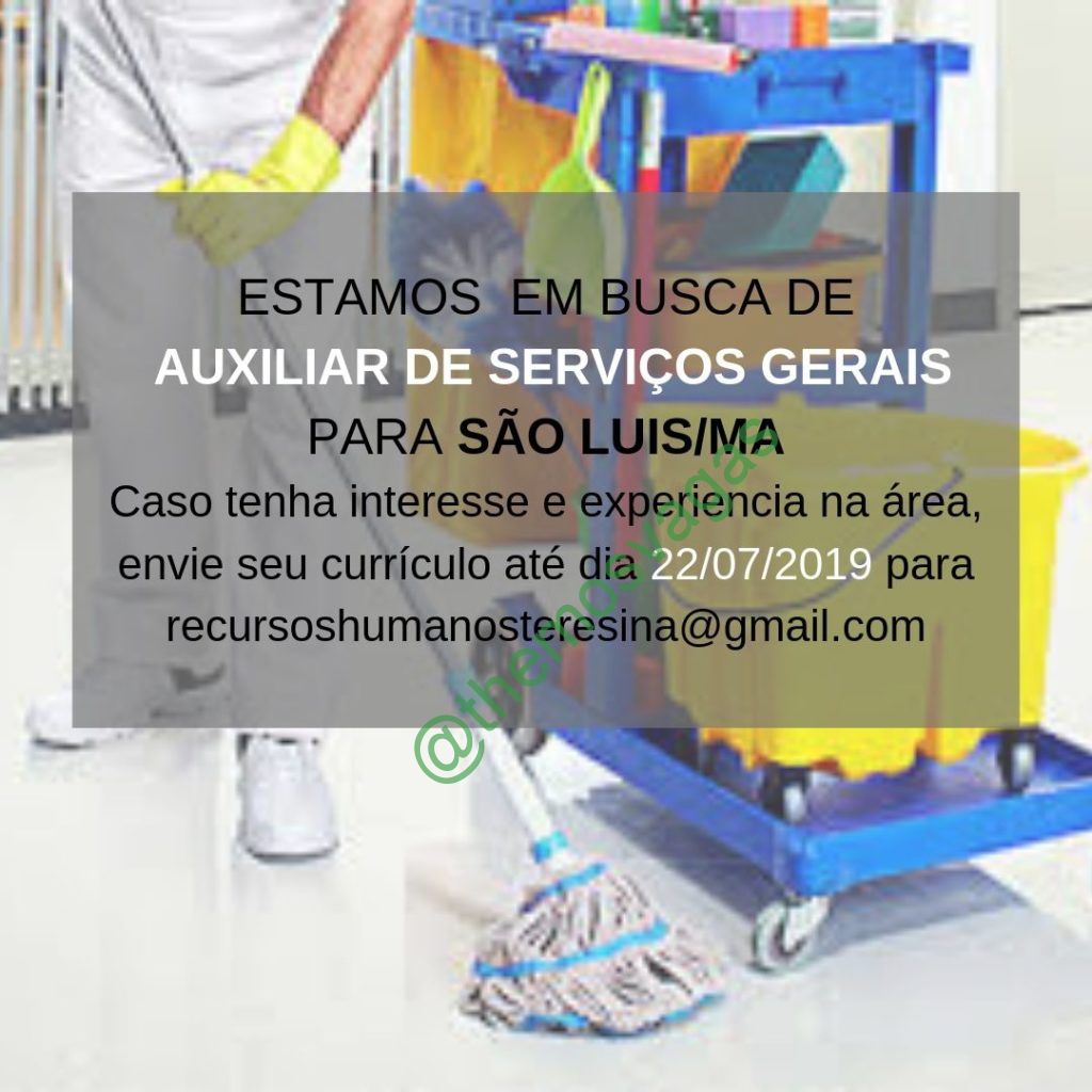– Interessados(as) e que atendam aos requisitos devem enviar o perfil profissional até o dia 22/07/2019, colocando no título do e-mail “Auxiliar de Serviços Gerais”, para:  recursoshumanosteresina@gmail.com