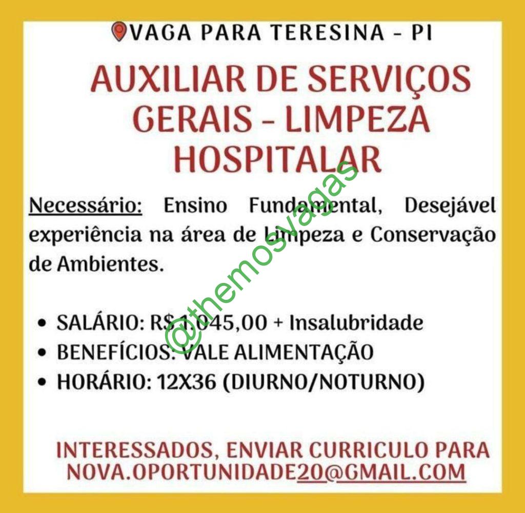 – Interessados(as) e que atendam ao perfil solicitado acima, devem enviar o currículo para o e-mail nova.oportunidade20@gmail.com contendo no título/assunto “Auxiliar de Serviços Gerais THE