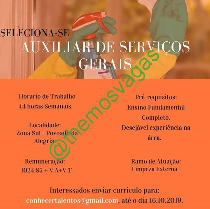 – Interessados(as) e que atendam ao perfil solicitado acima, devem enviar o currículo até 16/10/2019 para o e-mail conhecertalentos@gmail.com contendo no título/assunto “Auxiliar de Serviços Gerais”.