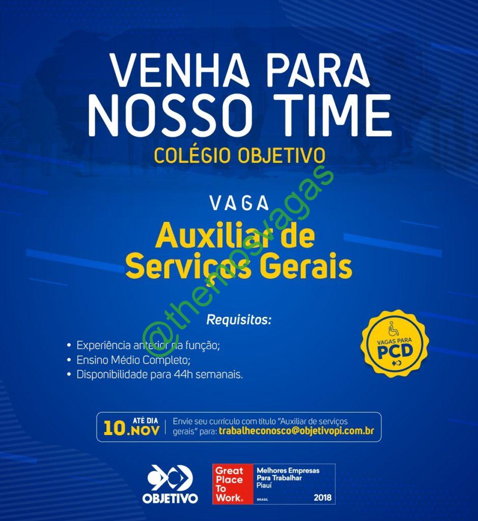 – Interessados(as) e que atendam ao perfil solicitado acima, devem enviar o currículo até 10/11/2019 para o e-mail trabalheconosco@objetivopi.com.br contendo no título/assunto “Auxiliar de Serviços Gerais THE“.
