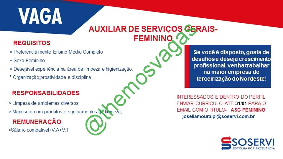 – Interessados(as) e que atendam ao perfil solicitado acima, devem enviar o currículo  até o dia 31/01/2020 para o e-mail joseliamoura.pi@soservi.com.br , colocando no título/assunto: “ASG Feminino”.