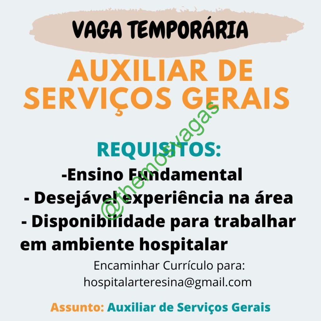 – Interessados(as) e que atendam ao perfil solicitado acima, devem enviar o currículo para o e-mail hospitalarteresina@gmail.com contendo no título/assunto “Auxiliar de Serviços Gerais THE