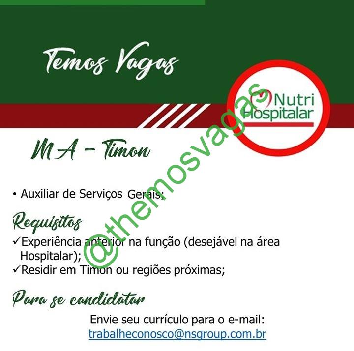 – Interessados(as) e que atendam ao perfil solicitado acima, devem enviar o currículo  para o e-mail trabalheconosco@nsgroup.com.br contendo no título/assunto “Auxiliar de Serviços Gerais Timon