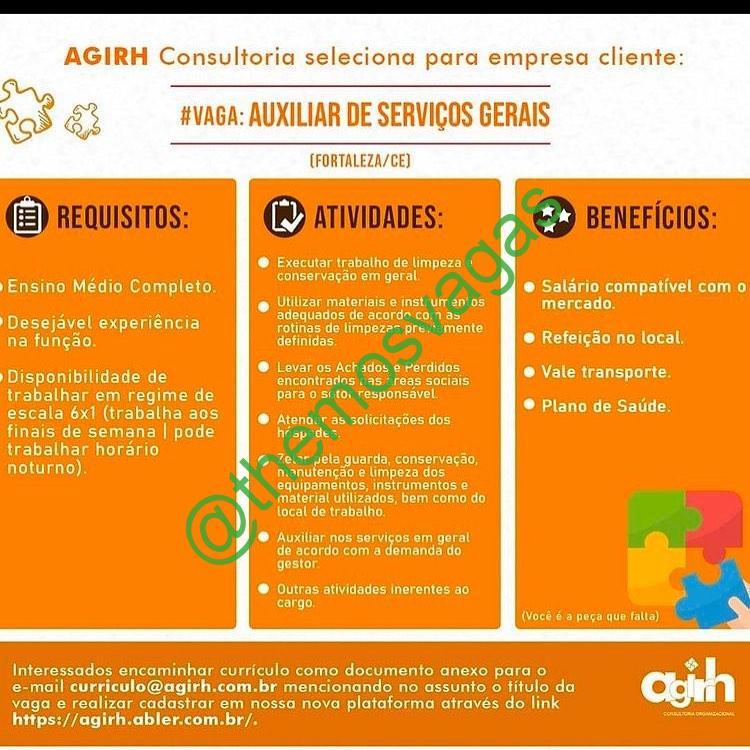 –  Interessados(as) e que atendam ao perfil solicitado acima, devem enviar o currículo para o e-mail curriculo@agirh.com.br, contendo no título/assunto “Auxiliar de Serviços Gerais FOR“.