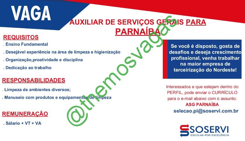 – Interessados(as) e que atendam ao perfil solicitado acima, devem enviar o currículo para o e-mail selecao.pi@soservi.com.br contendo no título/assunto “ASG Parnaíba