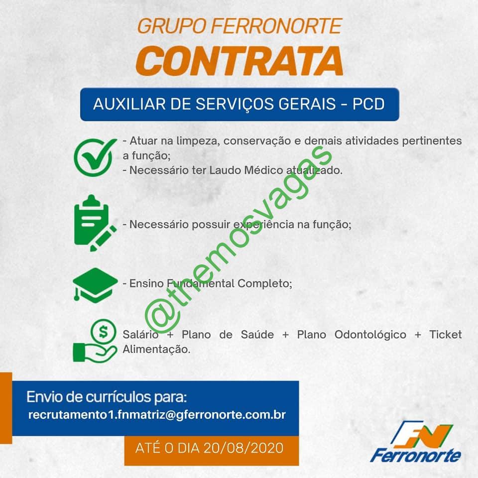 – Interessados(as) e que atendam ao perfil solicitado acima, devem enviar o currículo até 20/08/2020 para o e-mail recrutamento1.fnmatriz@gferronorte.com.br contendo no título/assunto “Auxiliar de Serviços Gerais PCD