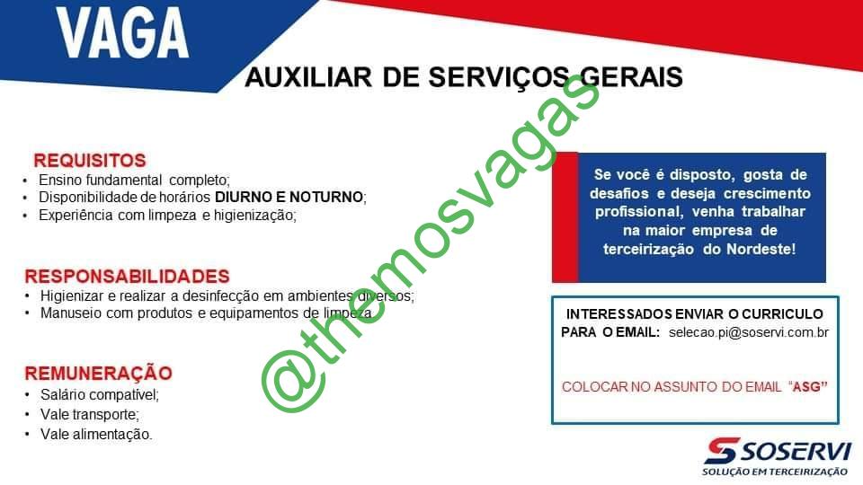 – Interessados(as) e que atendam ao perfil solicitado acima, devem enviar o currículo para o e-mail selecao.pi@soservi.com.br contendo no título/assunto “ASG