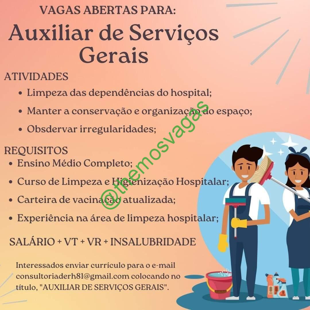 – Interessados(as) e que atendam ao perfil solicitado acima, devem enviar o currículo para o e-mail consultoriaderh81@gmail.com contendo no título/assunto “Auxiliar de Serviços Gerais – THE