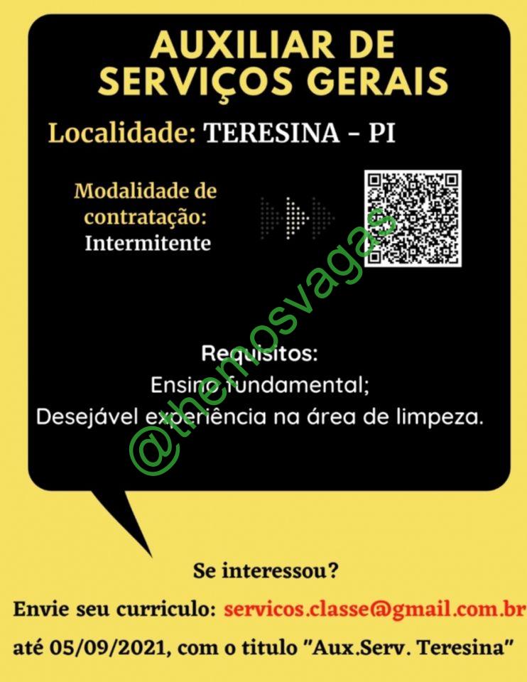 – Interessados(as) e que atendam ao perfil solicitado acima, devem enviar o currículo até 05/09/2021 para o e-mail servicos.classe@gmail.com.br , contendo no título/assunto “Aux.Serv. Teresina”.