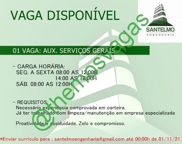 – Interessados(as) e que atendam ao perfil solicitado acima, devem enviar o currículo até 01/11/2021 para o e-mail santelmoengenharia@gmail.com, contendo no titulo/assunto “Auxiliar de Serviços Gerais – THE