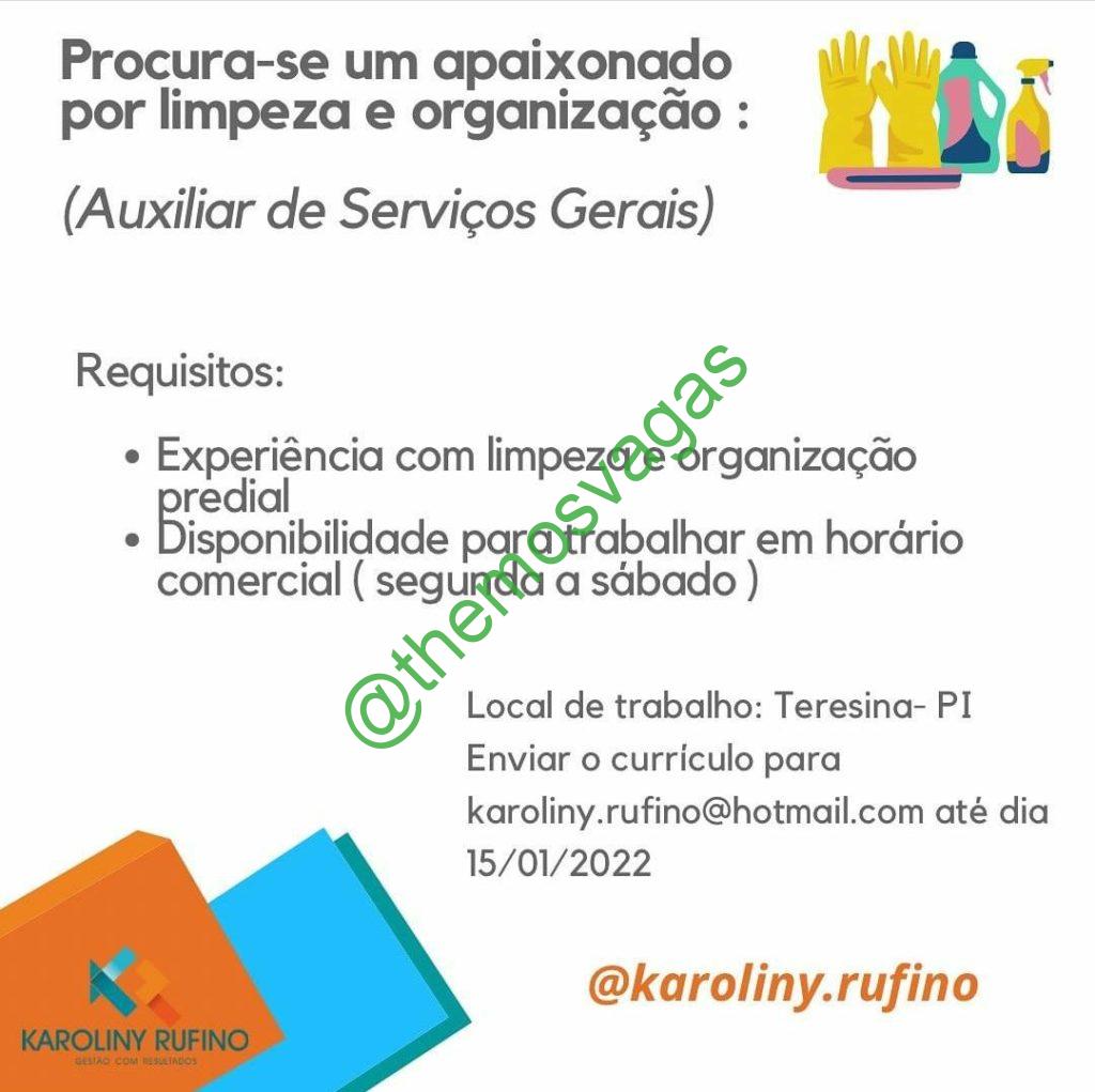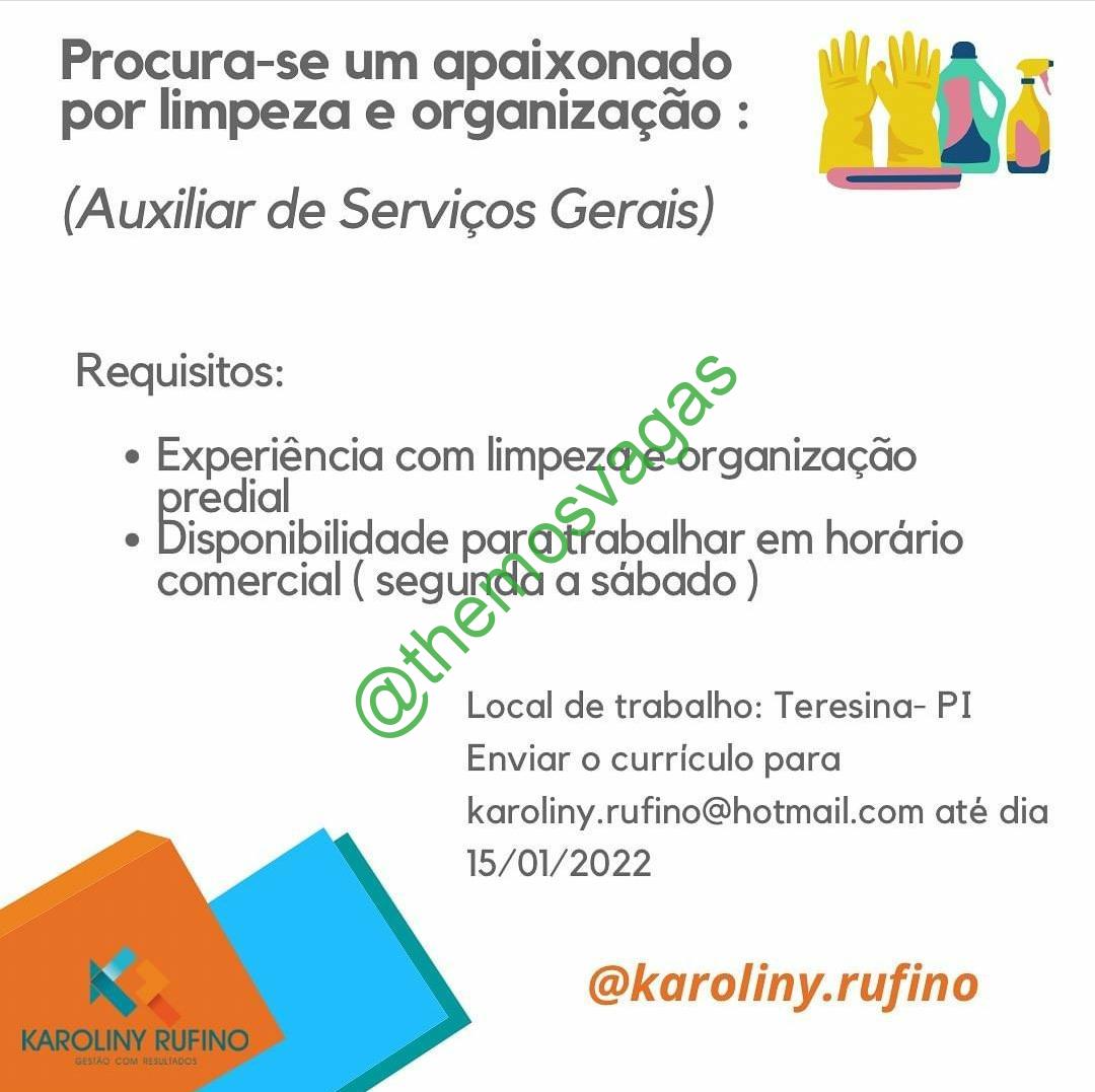 – Interessados(as) e que atendam ao perfil solicitado acima, devem enviar o currículo até 15/01/2022  para o e-mail karoliny.rufino@hotmail.com contendo no título/assunto “Auxiliar de Serviços Gerais THE