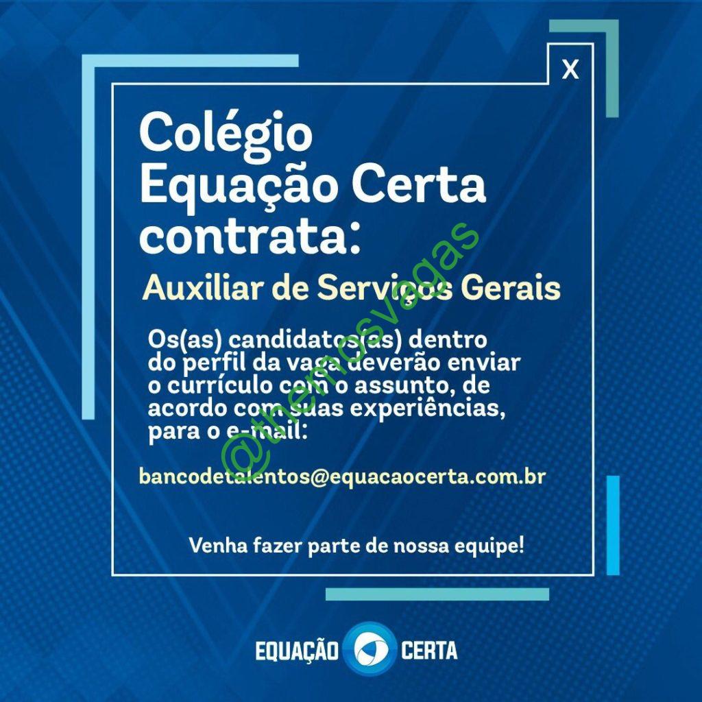 – Interessados(as) e que atendam ao perfil solicitado acima, devem enviar o currículo para o e-mail bancodetalentos@equacaocerta.com.br contendo no título/assunto “Auxiliar de Serviços Gerais THE