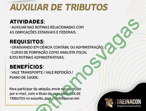 – Interessados(as) e que atendam ao perfil solicitado acima, devem enviar o currículo para o e-mail rh@treinacon.net , colocando no título “Auxiliar de Tributos”.