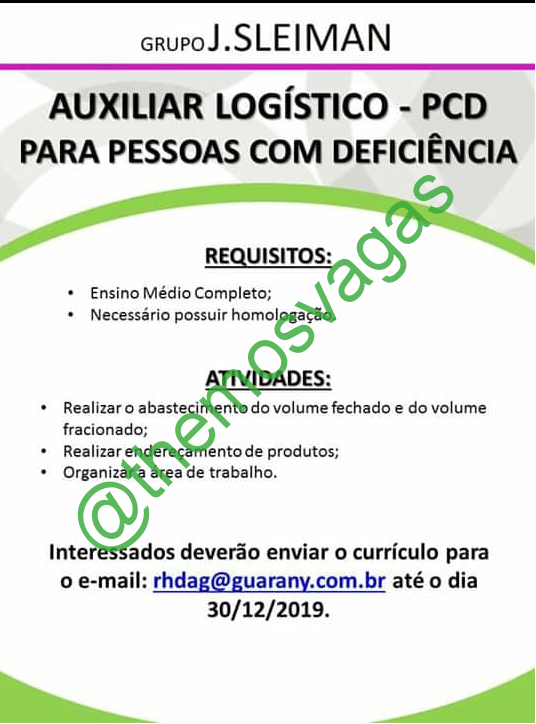 – Interessados(as) e que atendam ao perfil solicitado acima, devem até o dia 30/12/2019 enviar o currículo para o e-mail rhdag@guarany.com.br , colocando no título “Auxiliar Logístico – PCD”.