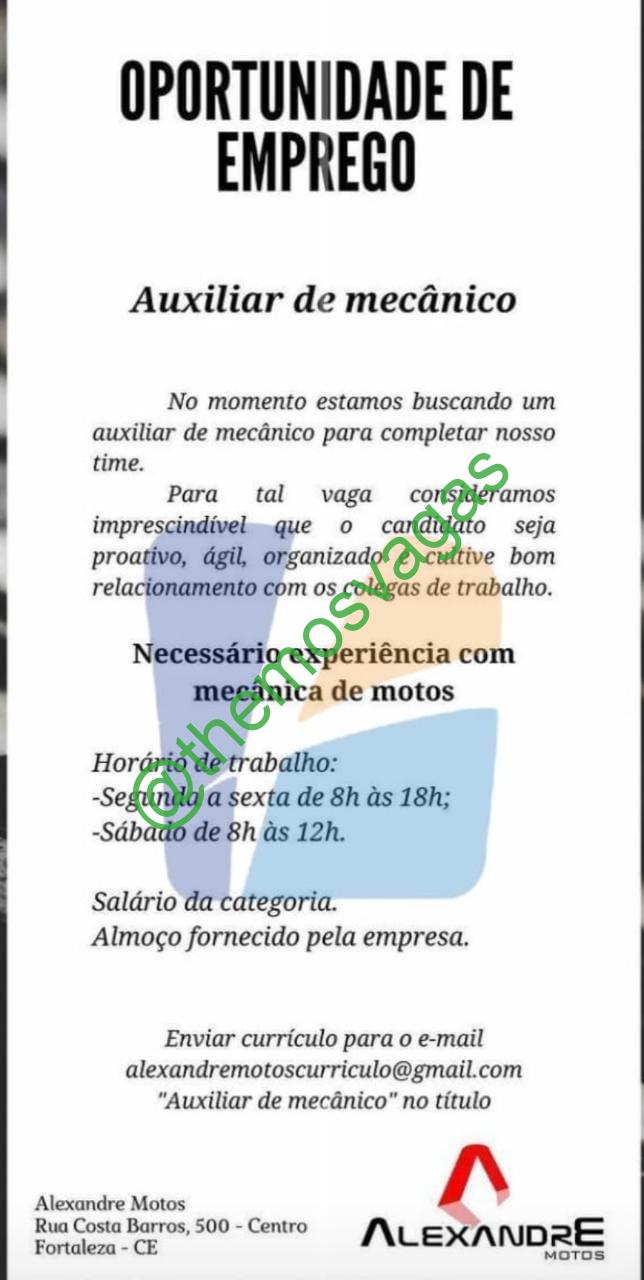 – Interessados(as) e que atendam ao perfil solicitado acima, devem enviar o currículo para o e-mail alexandremotos@gmail.com, contendo no título/assunto “Auxiliar Mecânico – FOR“.