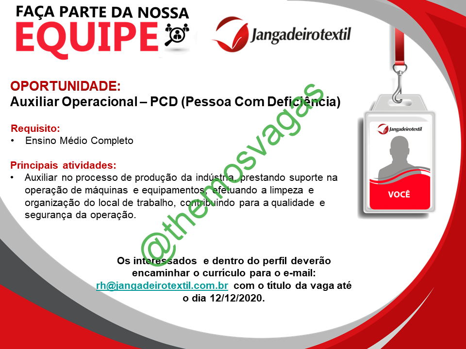 – Interessados(as) e que atendam ao perfil solicitado acima, devem até o dia 12|12|2020 enviar o currículo para o e-mail rh@jangadeirotextil.com.br , contendo no título/assunto “Auxiliar Operacional – PCD – FOR“.