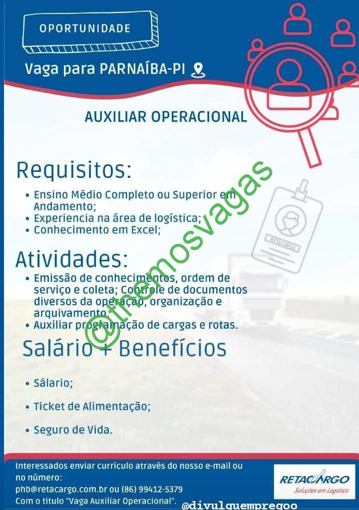 – Interessados(as) e que atendam ao perfil solicitado acima, devem enviar o currículo para o e-mail phb@retacargo.com.br contendo no título/assunto “Vaga Auxiliar Operacional” ou através do whatsapp 86 9412-5379