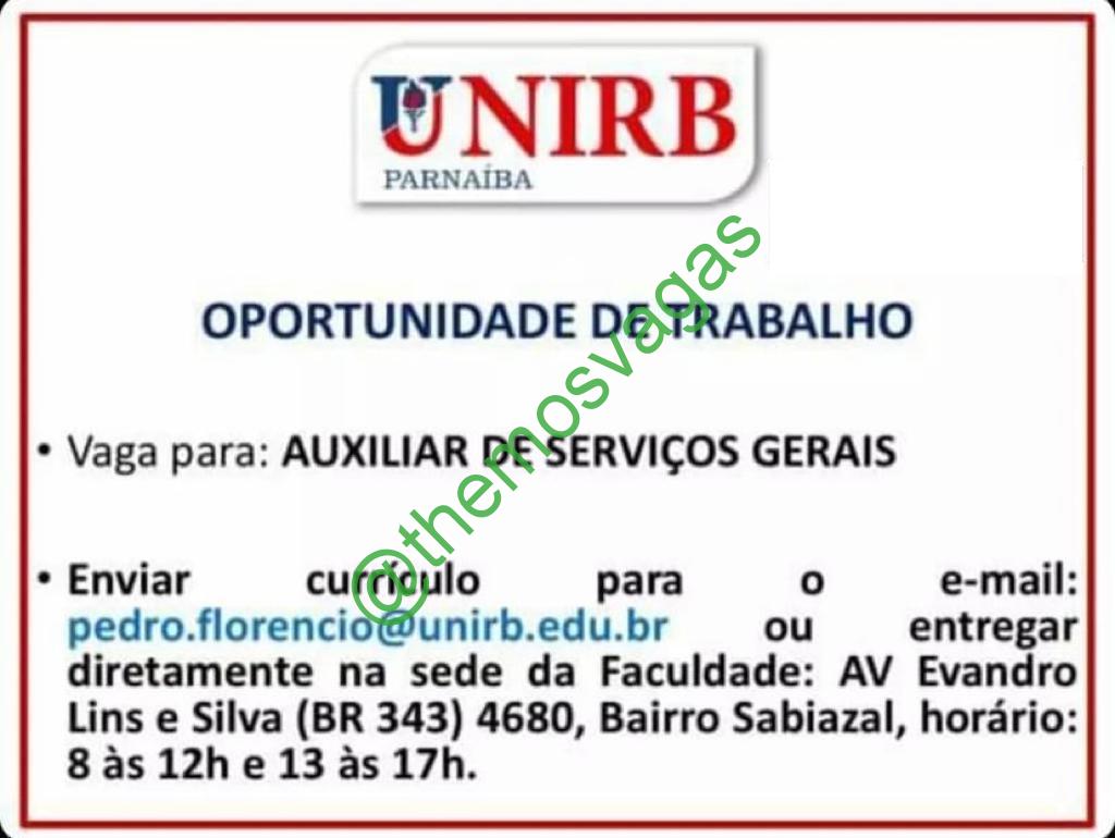 – Interessados(as) e que atendam ao perfil solicitado acima, devem enviar o currículo para o e-mail pedro.florencio@unirb.edu.br contendo no título/assunto “Aux Serviços Gerais – PHB” ou entregar no seguinte endereço: Avenida Evandro Lins e Silva, 4680, Bairro Sabiazal, BR 343, Parnaíba/PI (Sede da Faculdade Unirb – entregar entre os horário de 8h às 12h e 13h às 17h).