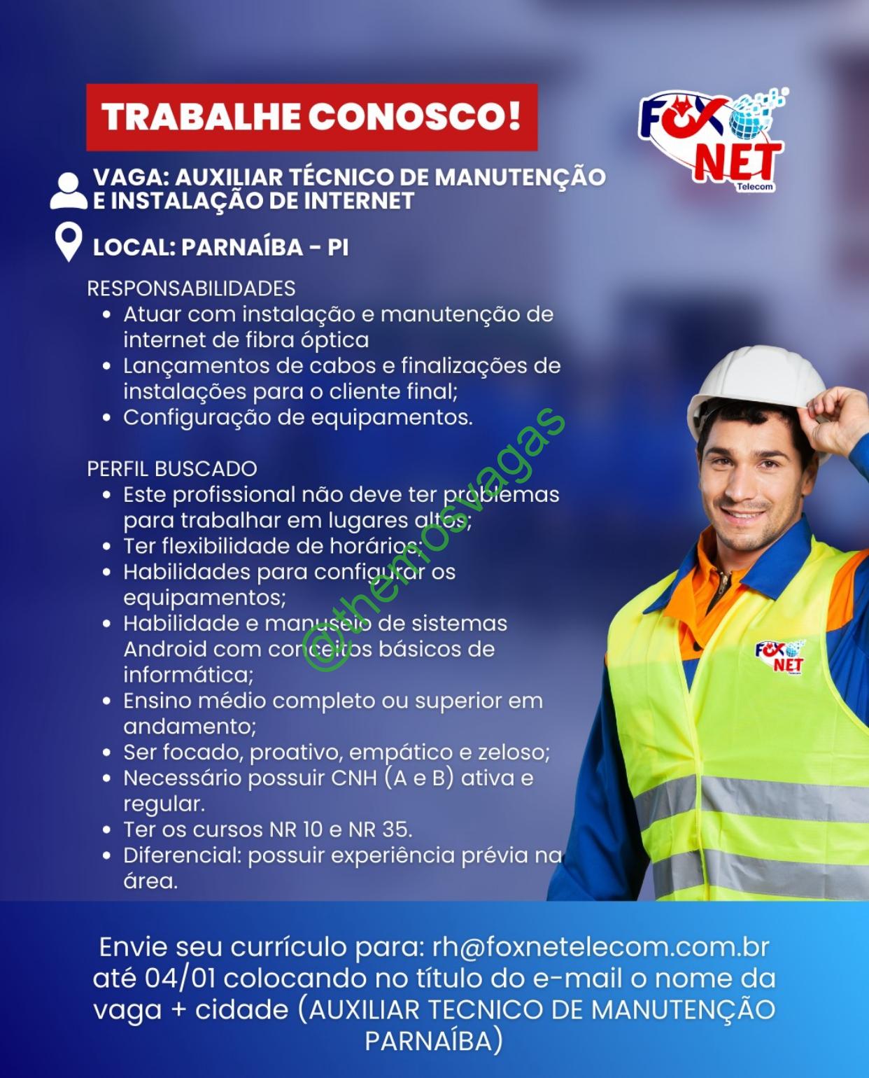 – Interessados(as) e que atendam ao perfil solicitado acima, devem enviar o currículo até 04/01/2023 para o e-mail rh@foxnetelecom.com.br contendo no título/assunto “Auxiliar Técnico de Manutenção Parnaíba”.