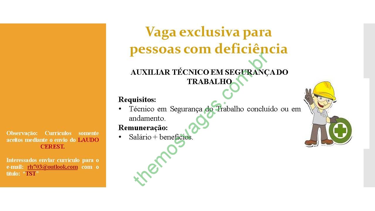 – Interessados(as) e que atendam aos requisitos devem enviar o perfil profissional e laudo médico, colocando no título do e-mail “TST”, para: rh703@outlook.com