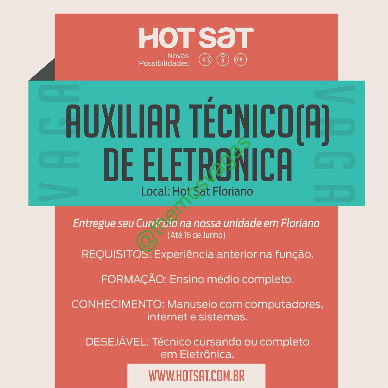 – Interessados(as) e que atendam ao perfil solicitado acima, devem enviar o currículo até 16/06/2021 para o e-mail rh@hotsat.com.br contendo no título/assunto “Auxiliar Técnico(a) em Eletrônica Floriano